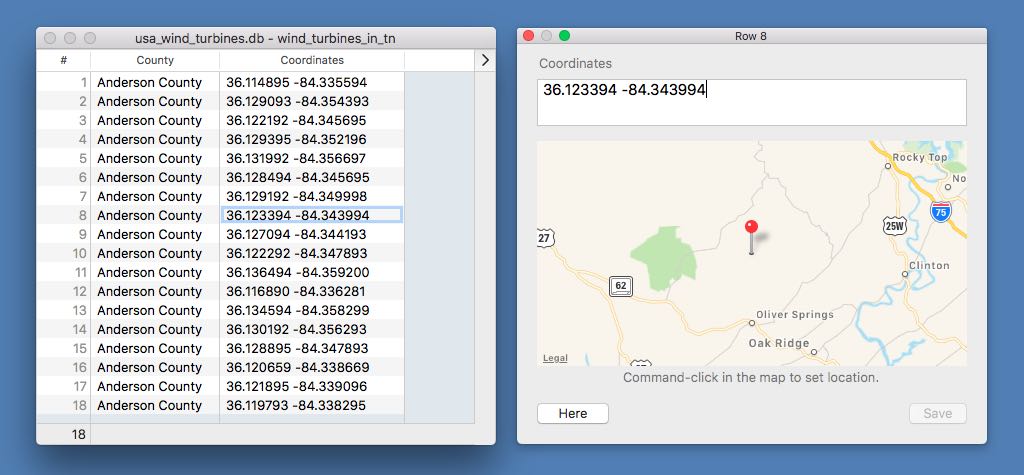 To find the wind turbines in Tennessee, a view was created using the following SQL in the SQL Console. Then the Name and Fields panel was modified by right-clicking on the view in the Rows Console and the Coordinates field format was changed to Location so that we could Command-double-click on a location to see it in a map view.